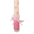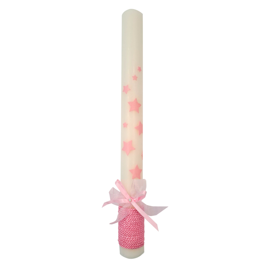Ciri per a bateig decorat amb llaç, corda i estrelles de color rosa.
