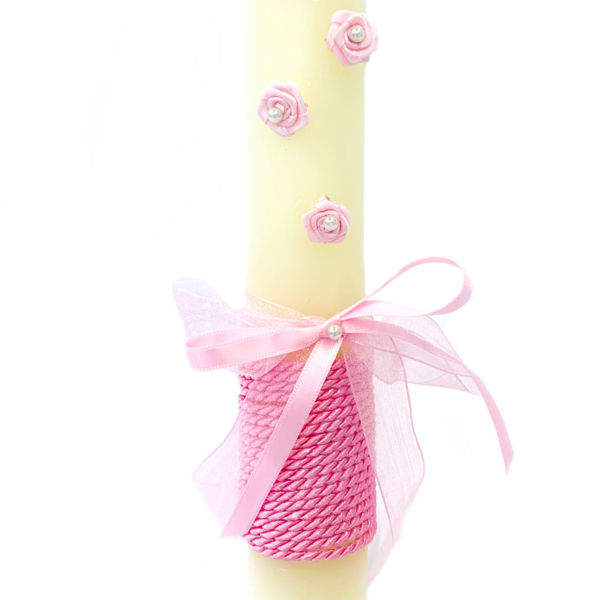 Ciri per a bateig de cera color beige clar decorat amb llaç, corda i petites roses de color rosa.