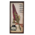 Preciós conjunt amb ploma color granat d’oca amb plometa, decorada amb engranatges estil retrofuturistes-steampunk i amb 5 plometes més per aconseguir el tipus de cal·ligrafia desitjada. Amb flascó de tinta i reposa plomes. Especial per a escriptura clàssica amb tinta.