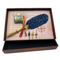 Precioso conjunto con pluma color azul estampada con estrellas doradas, con 3 plumillas más para conseguir el tipo de caligrafía deseada y con frasco de tinta. Especial para escritura clásica con tinta.
